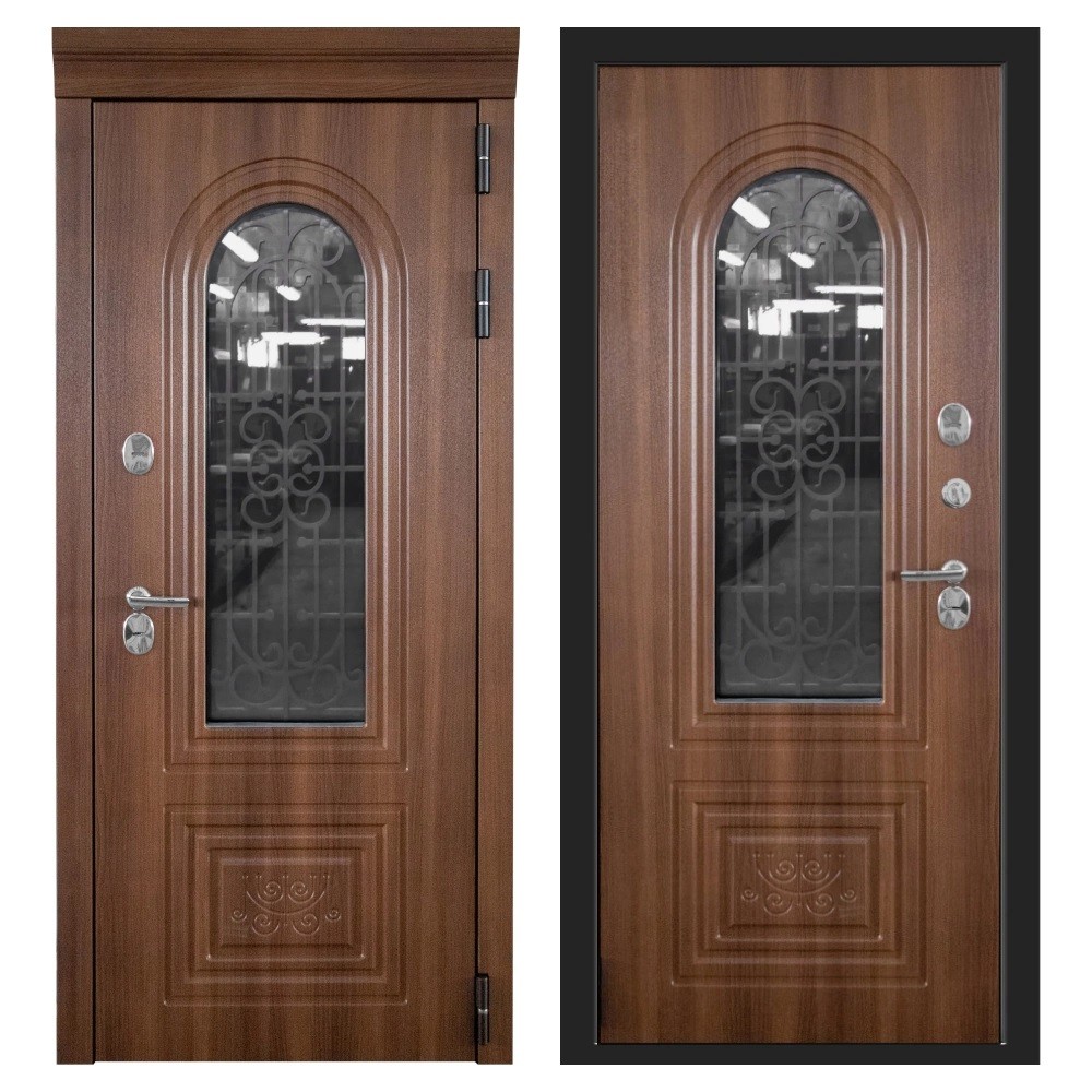 Дверной блок с комбинированным утеплителем и терморазрывом предназначен для установки внутри и снаружи помещения. Оснащен трехконтурным уплотнителем, ночной задвижной, четырехкамерным стеклопакетом с внутренней кованной решеткой.