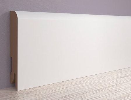 МДФ плинтус от компании "Лука". Перекроет зазор между стеной и полом до 16 мм.