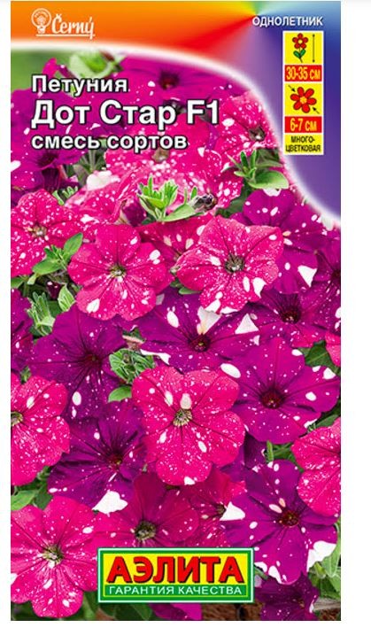 Петуния Дот Стар F1 смесь сортов - это сорт чешской селекции от компании Černý – одна из самых популярных расцветок. Неповторимая серия гибридов «Дот Стар» представлена многоцветковой петунией с потрясающим, контрастным рисунком лепестков, повторяющим звездное небо. Каждый цветок индивидуален: форма и количество белых вкраплений меняется в зависимости от погодных условий. Растения высотой 30-35 см. Активно растут и развиваются, формируя симпатичные, плотные кустики с большим количеством цветков Ø 6-7 см. Яркая петуния украсит любую клумбу, вазон, подвесное кашпо, став изюминкой вашего сада!