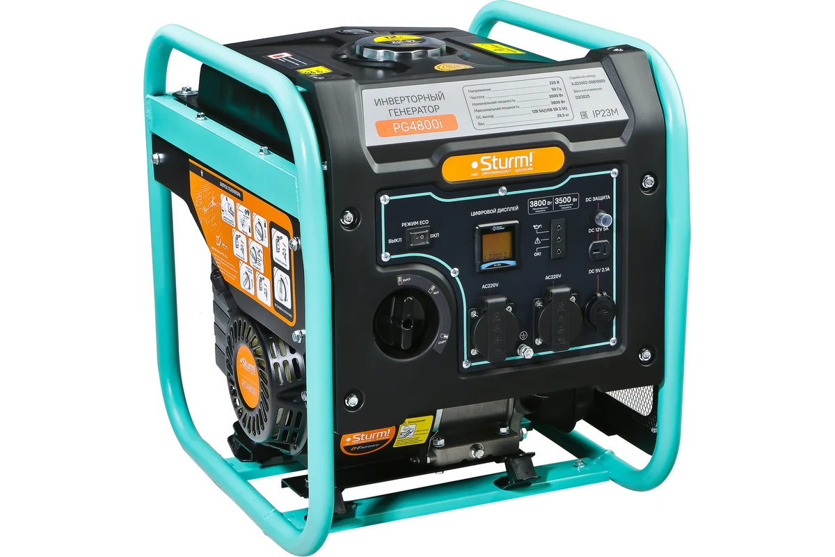 Генератор Sturm! PG4800i инвертор 3,8/3,5КВт 12л 220В ручной запуск  обеспечивает чистую синусоиду на выходе и высокую точность частоты и напряжения. Это позволяет без рисков подключать чувствительные электронные устройства, например, компьютеров, отопительных котлов, медицинского оборудования, современных холодильников, аудио- и видеотехники, цифровой техники (гаджетов, смартфонов, планшетов). Данная модель отличается компактностью и меньшим весом по сравнению с традиционными генераторами. На панели управления генератора выведены 2 стандартные розетки 220В, розетка 12В и USB выход. Многофункциональный дисплей отображает основные параметры работы генератора - напряжение, частота и время работы. Все розетки имеют защиту от влаги и пыли.. Для работы агрегата потребуется 12 л бензина АИ-92. Этого хватит, чтобы переждать отключение света, спокойно пользуясь осветительными приборами, бытовой техникой и инструментами. Экономичный режим работы генератора позволяет снижать расход топлива и экономить топливо при небольших нагрузках.