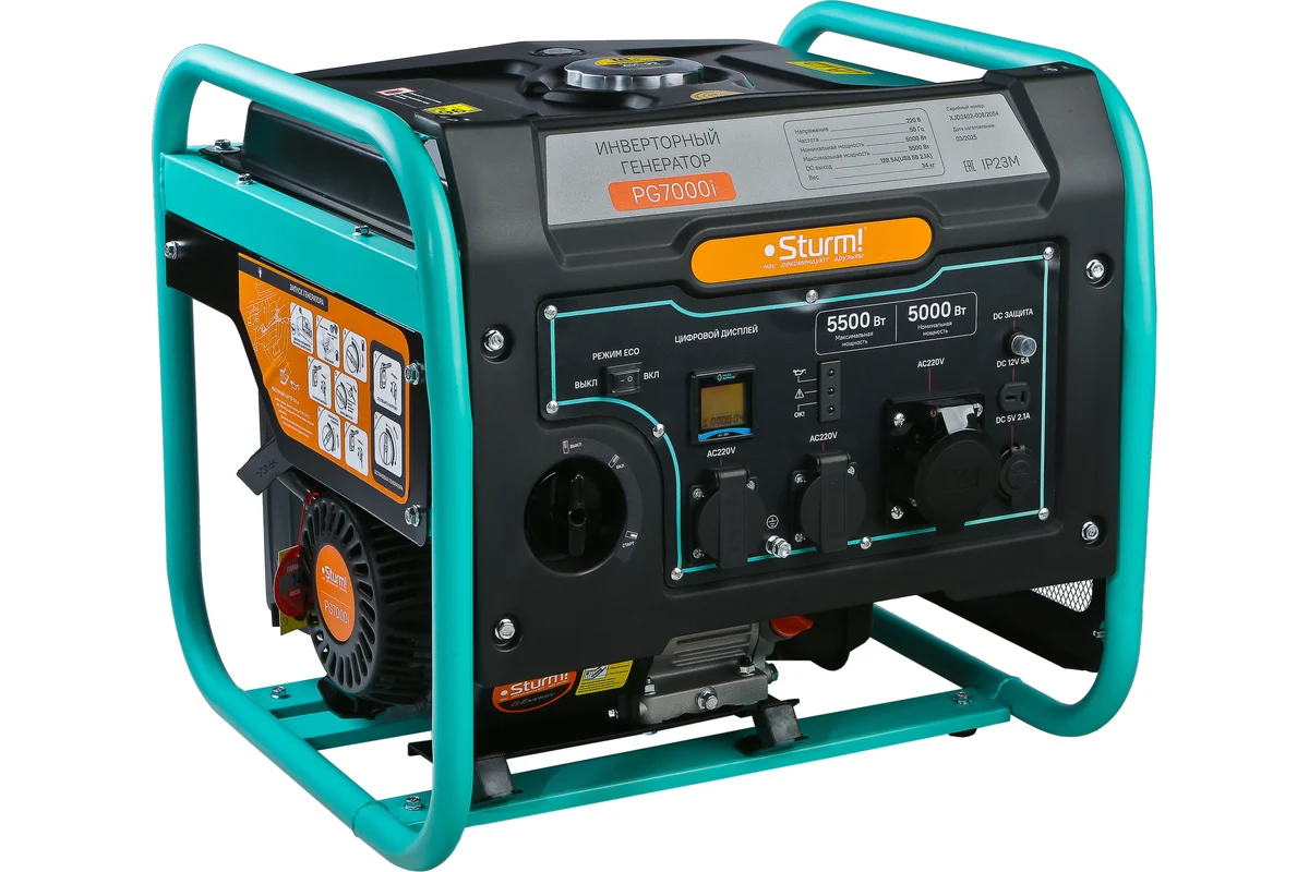 Генератор Sturm! PG7000i инвертор 5,5/5,0КВт 18л 220В ручной запуск обеспечивает чистую синусоиду на выходе и высокую точность частоты и напряжения. Это позволяет без рисков подключать чувствительные электронные устройства, например, компьютеров, отопительных котлов, медицинского оборудования, современных холодильников, аудио- и видеотехники, цифровой техники (гаджетов, смартфонов, планшетов). На панели управления генератора выведены 2 стандартные розетки 220В, силовая розетка, розетка 12В и USB выход. Многофункциональный дисплей отображает основные параметры работы генератора - напряжение, частота и время работы. Все розетки имеют защиту от влаги и пыли.. Для работы агрегата потребуется 18 л бензина АИ-92. Этого хватит, чтобы переждать отключение света, спокойно пользуясь осветительными приборами, бытовой техникой и инструментами. Экономичный режим работы генератора позволяет снижать расход топлива и экономить топливо при небольших нагрузках.