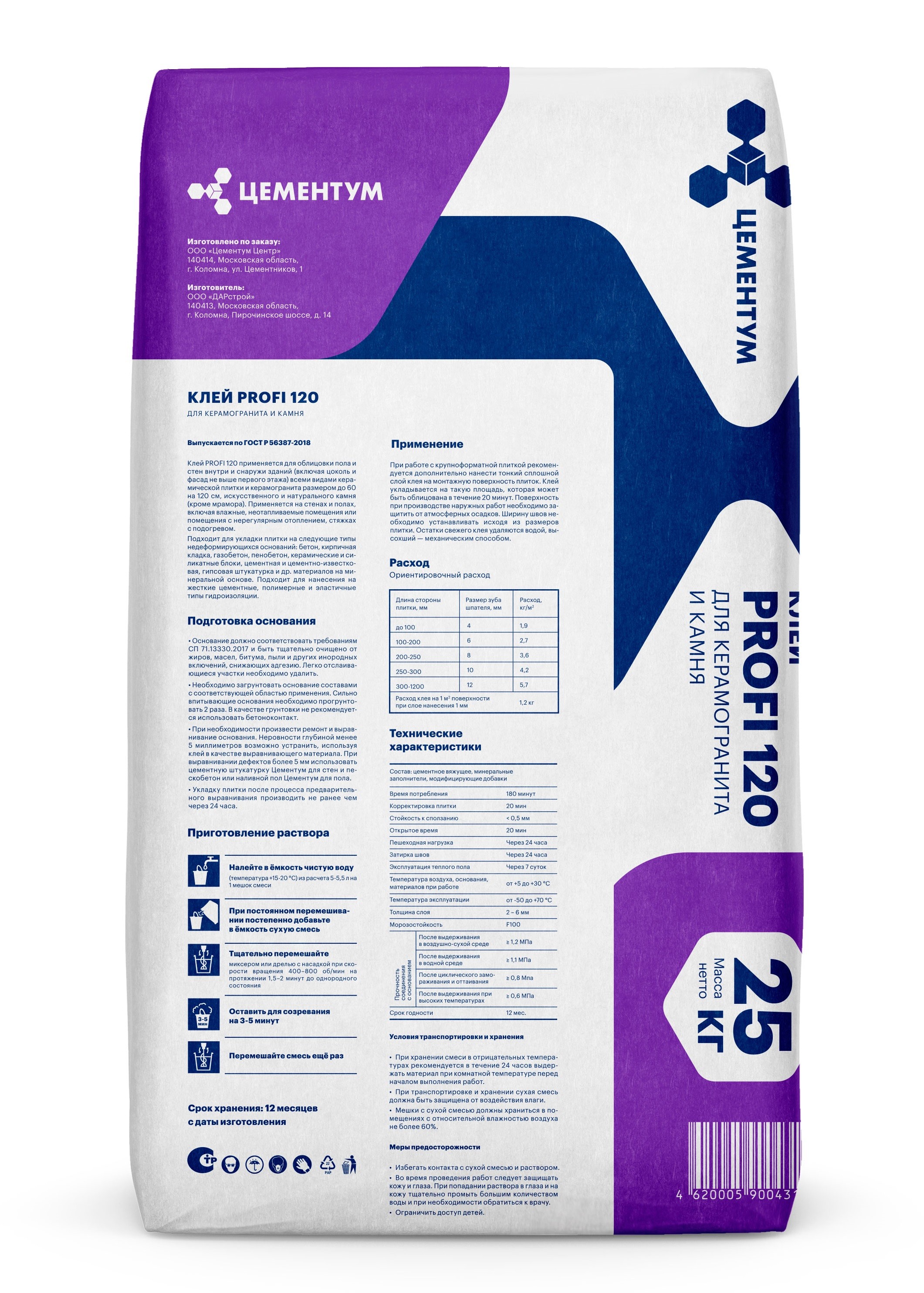 Содержимое мешка при постоянном перемешивании постепенно засыпать в емкость и перемешать до однородной массы, выдержать 3-5 минут и перемешать еще раз на протяжение 1-2 минуты. Нанесение раствора и укладка плитки Клей нанести на подготовленное основание с помощью шпателя или кельмы, затем разровнять зубчатым шпателем, который выбирается исходя из размера плитки. При работе с крупноформатной плиткой рекомендуется дополнительно нанести тонкий сплошной слой клея на монтажную поверхность плитки. Клей укладывается на такую площадь, которая может быть облицована в течение 20 минут. Корректировку плитки производить не позднее 20 минут после укладки. Плитку недопустимо укладывать без зазора, ширину швов необходимо устанавливать исходя из размеров плитки. Остатки свежего клея удаляются водой, высохший - механическим способом.Пешеходная нагрузка и затирка швов возможны не раньше 24 часов с момента укладки.